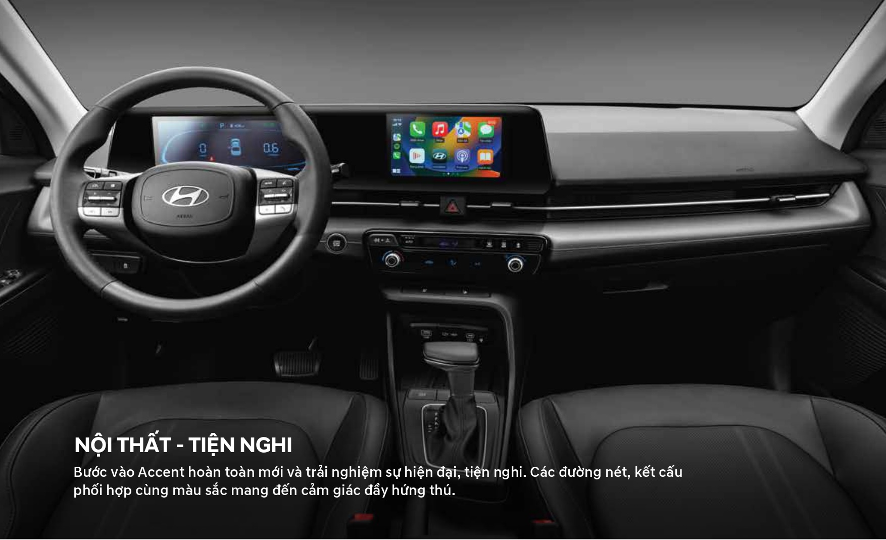 Ghế bọc da, tích hợp tính năng làm mát trên một số phiên bản. Hệ thống điều hòa tự động, cửa gió điều hòa ghế sau. Ở thế hệ mới, Accent 2024 trang bị cổng sạc USB-C cho hàng ghế trước và sau. Sạc không dây, khởi động xe từ xa.