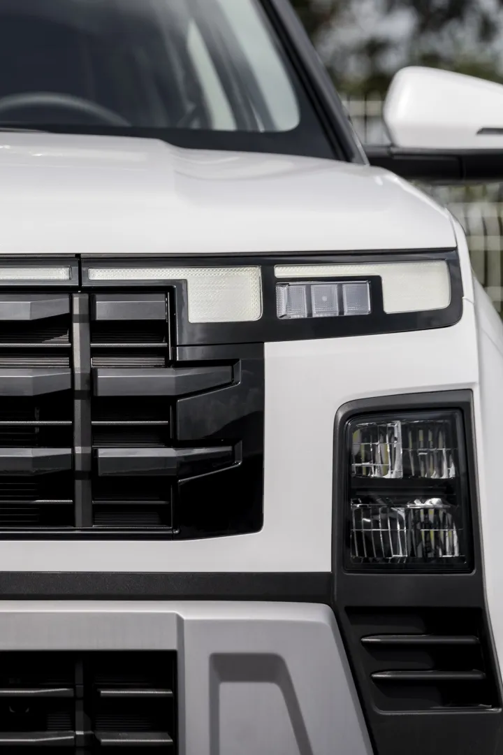 Đầu xe gây ấn tượng với lưới tản nhiệt tối màu mạ chrome mới, kết hợp cụm đèn pha LED tứ giác liền mạch và đèn ban ngày LED cải tiến, mang lại tầm nhìn tối ưu và phong cách hiện đại. Ca-pô được tái thiết kế, tạo cảm giác cơ bắp với cảm hứng đến từ đàn anh Hyundai Palisade.