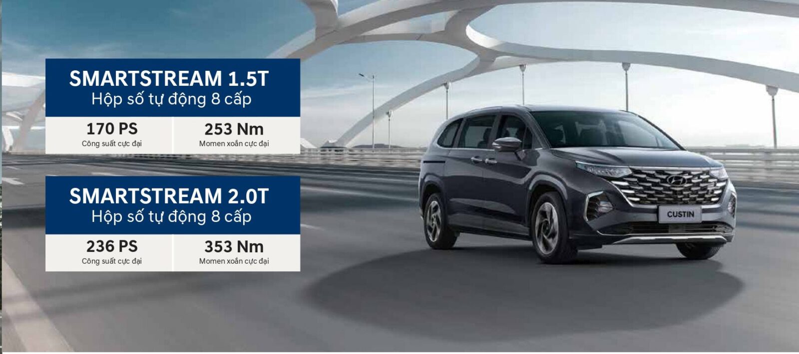 Hyundai Custin được trang bị hệ dẫn động cầu trước FWD với 2 phiên bản động cơ, gồm: