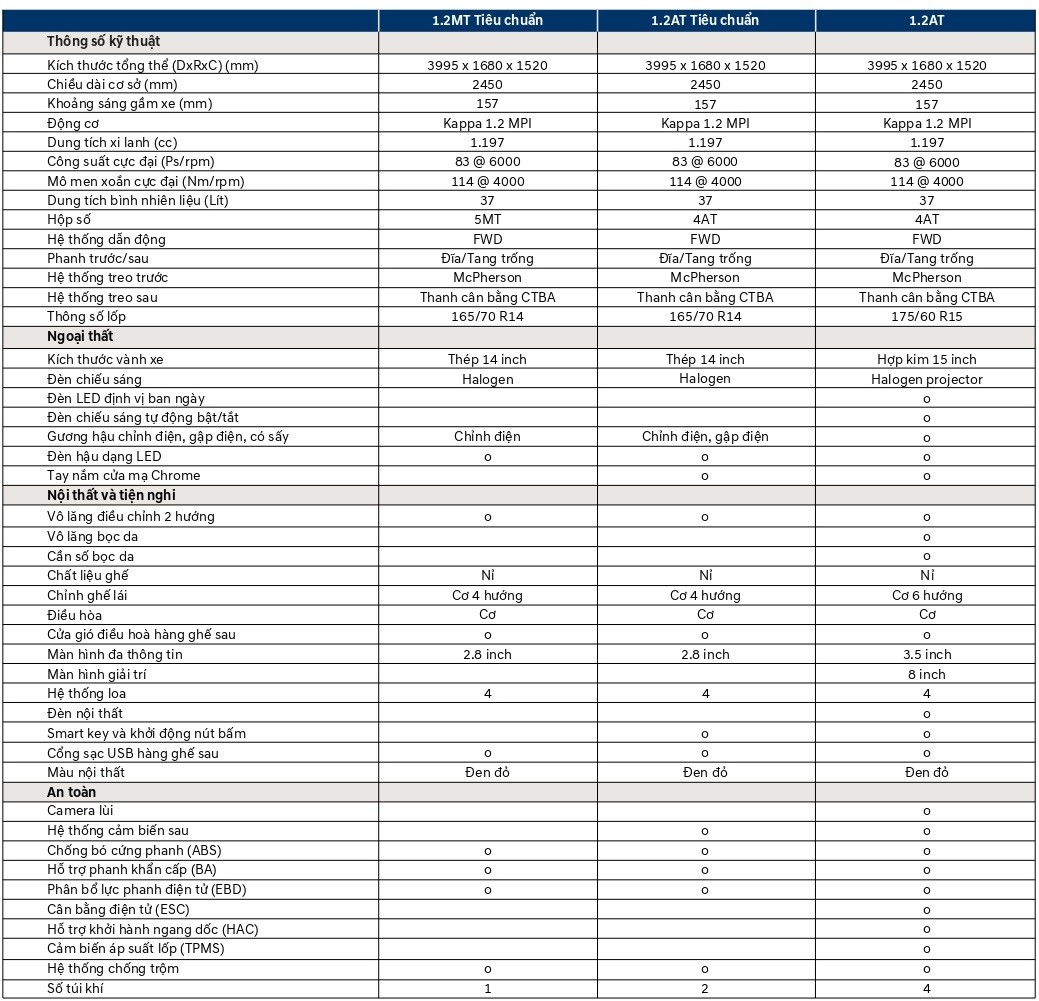 Động cơ 4 xylanh Kappa dung tích 1.2L, đi cùng công nghệ van biến thiên CVVT, cho công suất cực đại 83 mã lực tại 6.000 vòng/phút và momen xoắn lớn nhất 114 Nm tại 4.000 vòng/phút. Đi cùng với đó là hệ dẫn động cầu trước FWD. Toàn bộ sức mạnh, khả năng vận hành của xe được dồn trực tiếp lên bánh xe trước, từ đó kéo theo 2 bánh sau tạo sự chuyển động cho xe.