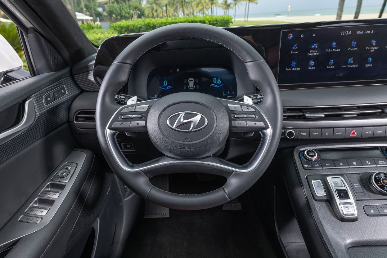 Tôn chỉ thiết kế khoang lái thân thiện với người dùng tiếp tục được Hyundai áp dụng cho Palisade 2024. Các nút bấm trên táp lô được bố trí gọn gàng trên thanh kim loại đẹp đẽ. Nổi bật nhất là khu vực cần số có thiết kế liền mạch với táp lô và bệ tỳ tay thường thấy trên những mẫu xe hạng sang.