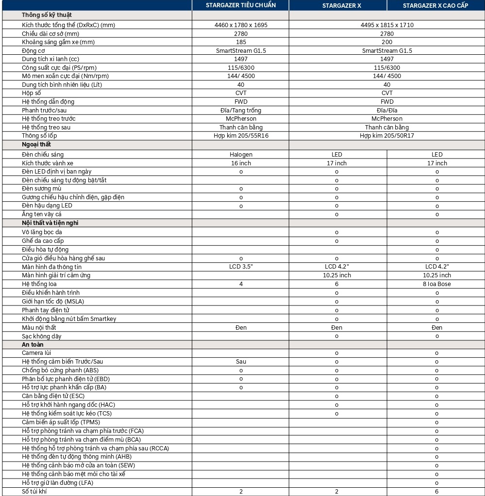 Bản tiêu chuẩn của Stargazer trang bị những tính năng cơ bản như đèn halogen, vô-lăng và ghế bọc nỉ, điều hòa chỉnh cơ. Xe không có màn hình giải trí, công nghệ an toàn chỉ được hỗ trợ bởi cảm biến lùi, phân phối lực phanh điện tử, ABS, không có cân bằng điện tử. Giá bán 489 triệu đồng của Stargazer 2024 rẻ nhất phân khúc. Vì vậy mẫu xe này được hướng đến nhóm khách hàng thực dụng, chủ yếu kinh doanh dịch vụ.